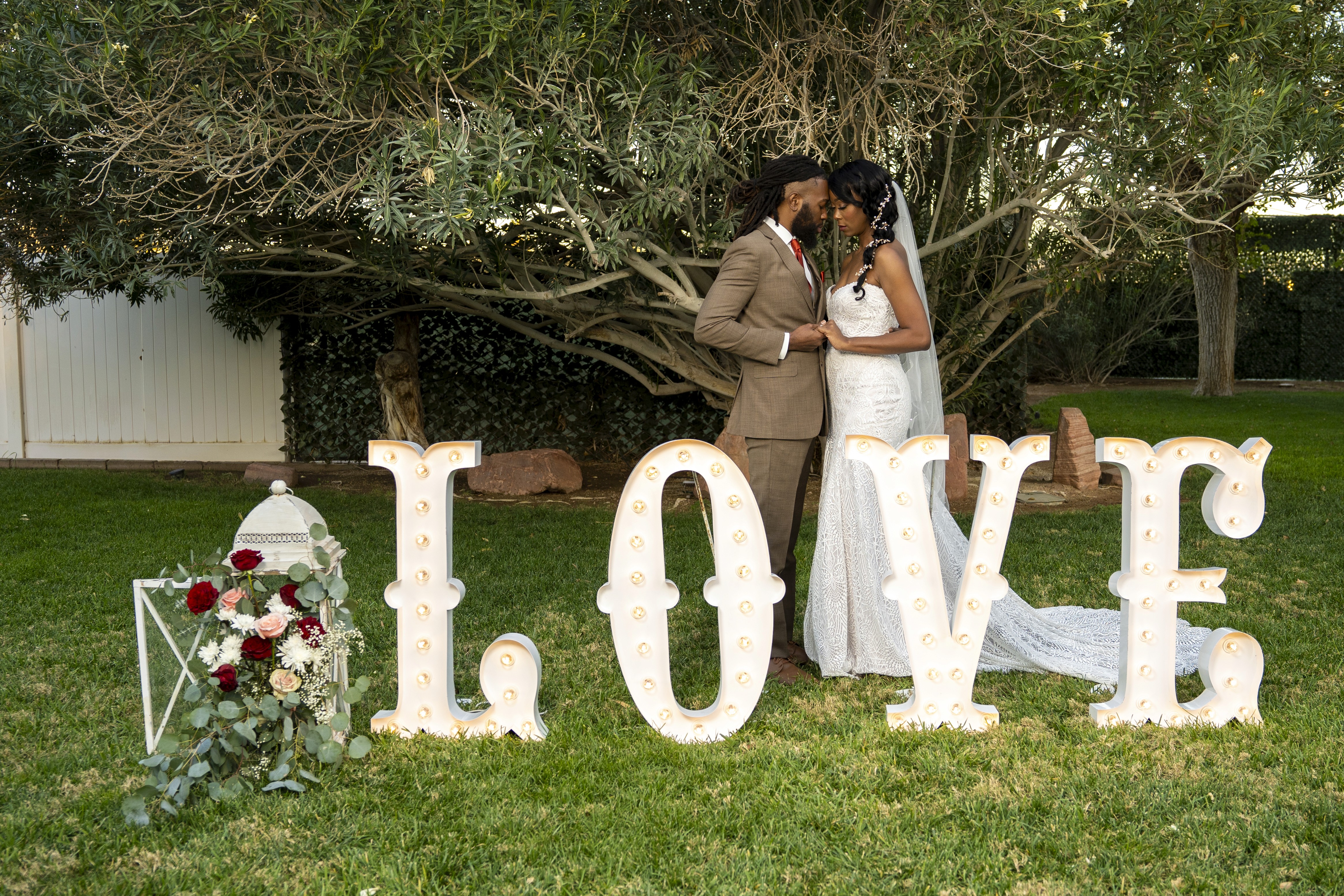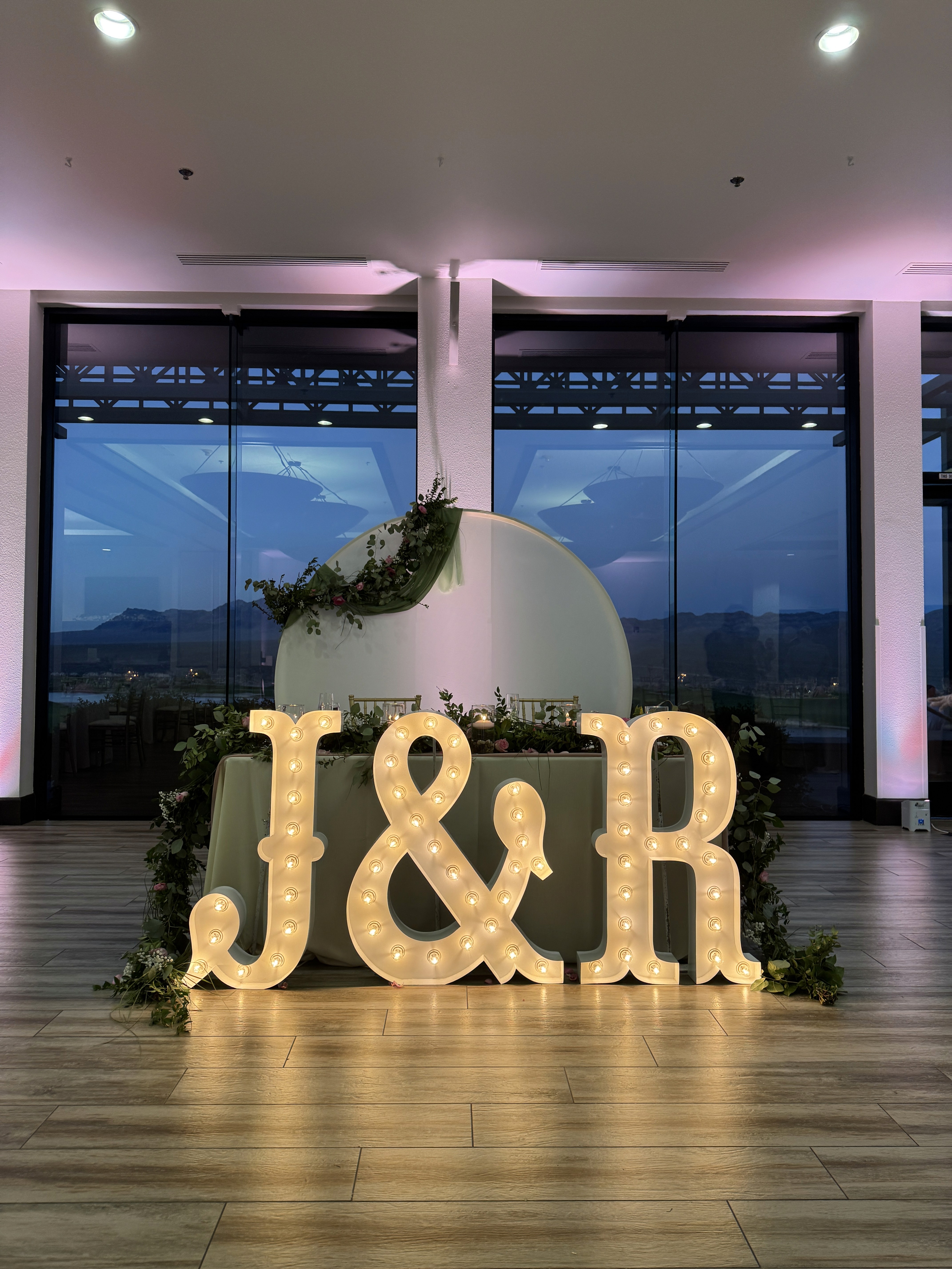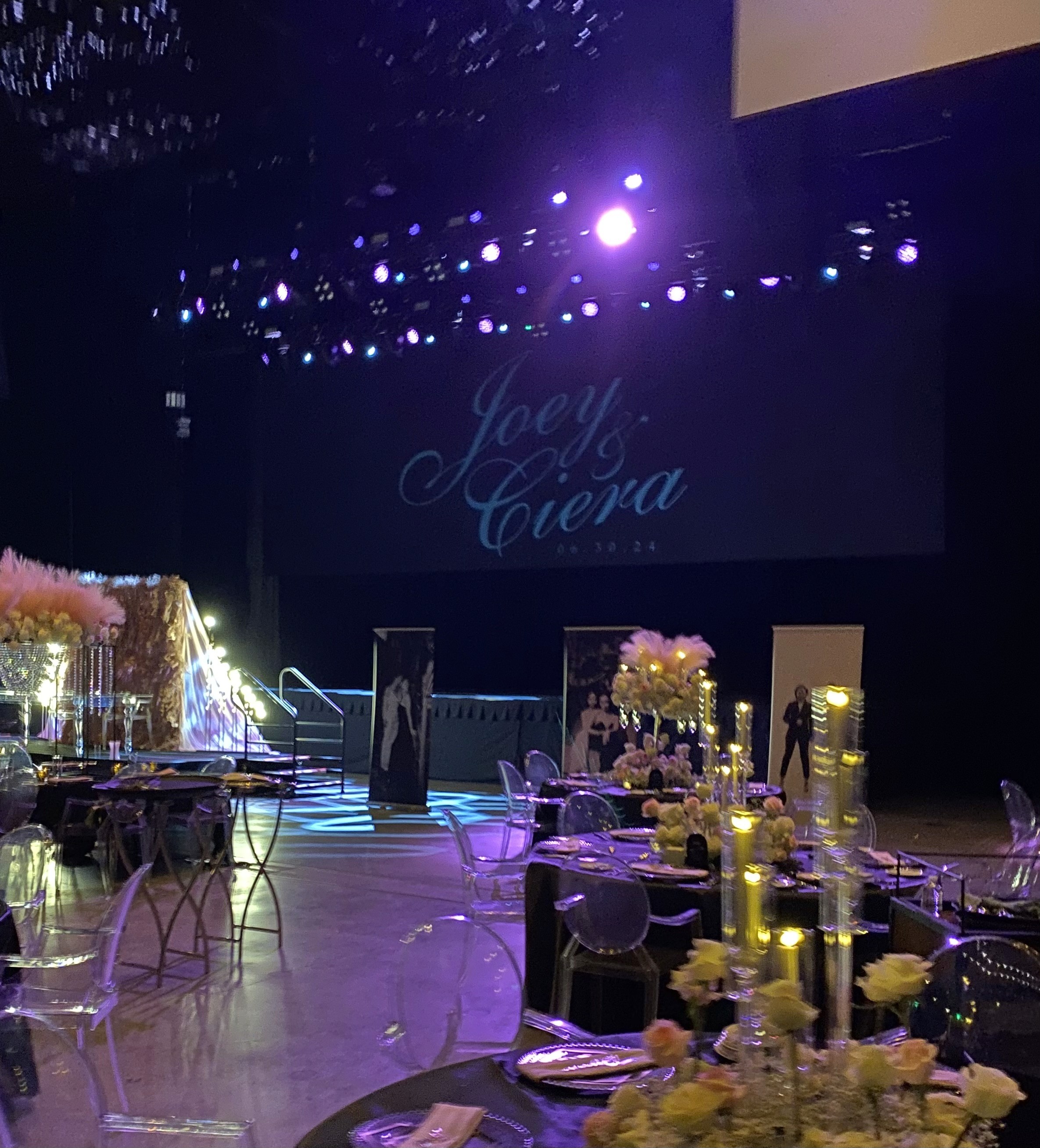 The right lighting transforms everything. Whether it's elegant uplighting, your names projected in a GOBO spotlight, or statement marquee letters—we help you create the perfect atmosphere.